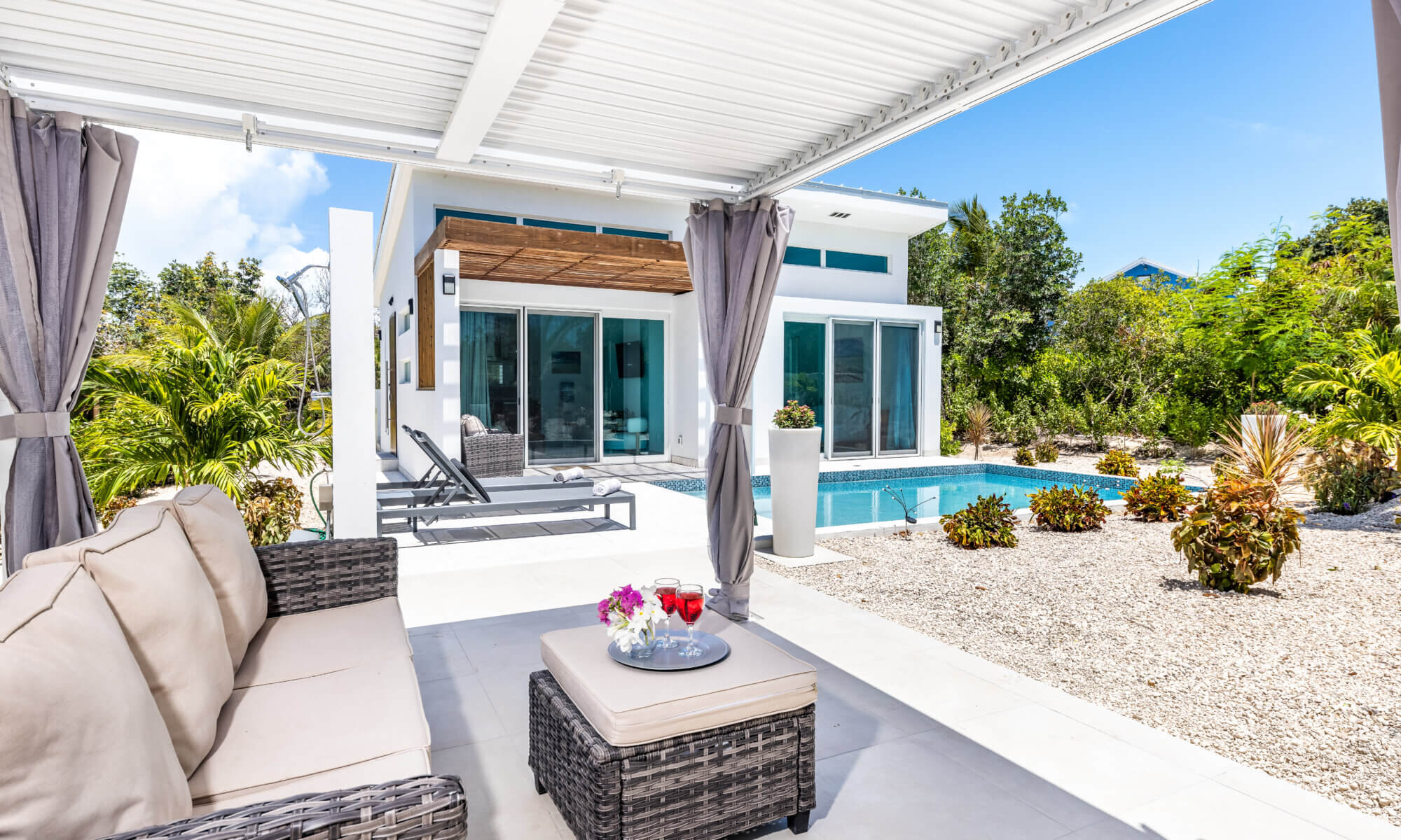 Gracehaven Villas is pleased to add our new building to our collection. Gracehaven House now provides a much-needed two-bedroom option for our guests. Newly built in 2025, this property has a large 20ft pool and plenty of outdoor areas, including a dining patio with BBQ grill and a large dining table with space for six guests, as well as a pool lounge deck and a pergola deck in the landscaped garden.