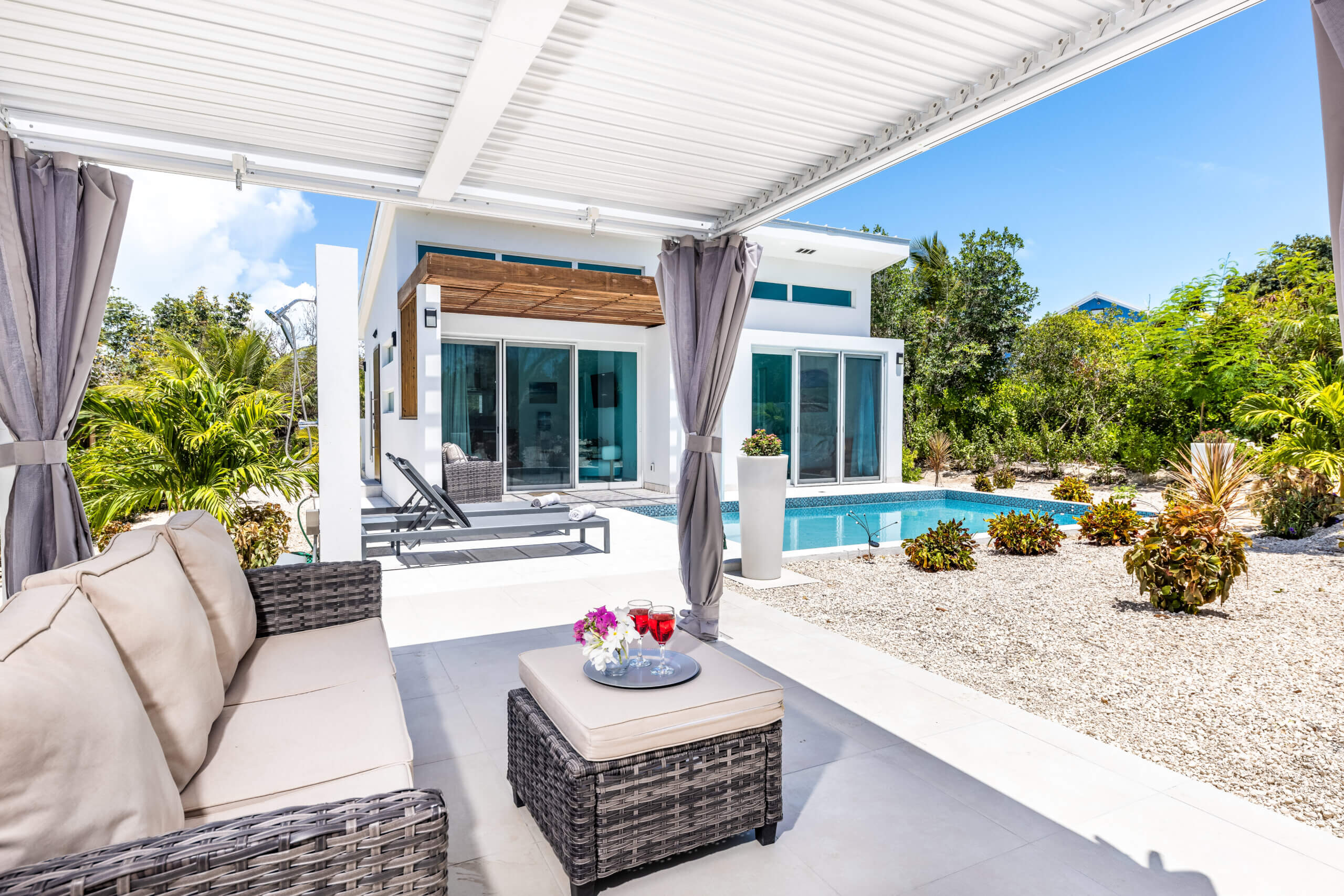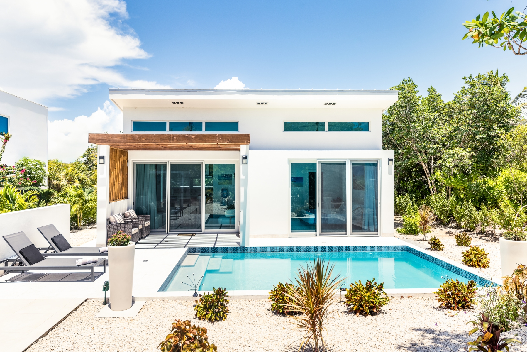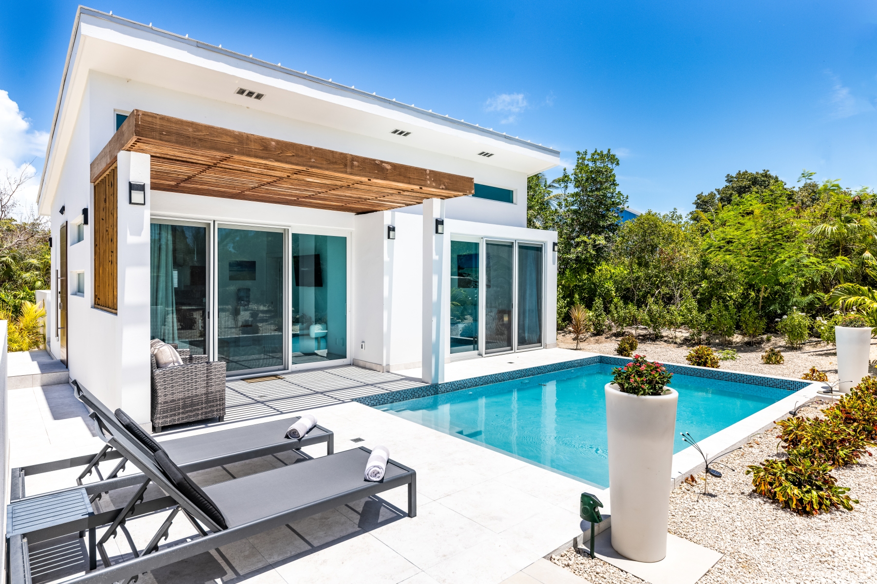 Gracehaven Villas is pleased to add our new building to our collection. Gracehaven House now provides a much-needed two-bedroom option for our guests. Newly built in 2025, this property has a large 20ft pool and plenty of outdoor areas, including a dining patio with BBQ grill and a large dining table with space for six guests, as well as a pool lounge deck and a pergola deck in the landscaped garden.