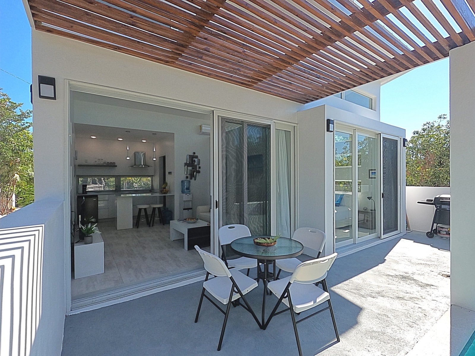 Set in its own garden and surrounded by natural brush, guests will have complete privacy while they enjoy the sun patio and pool. The accommodation features one bedroom with 13.5 ft ceilings showered with natural light. A king bed , smart TV and ensuite washroom. The light and airy living area has a large comfortable sofa, smart TV and a kitchen with 4-burner cooktop and microwave plus a breakfast bar. Convenient appliances include a washer/dryer, toaster, sandwich maker and BBQ. Outdoor dining is easy on the porch deck under the pergola.